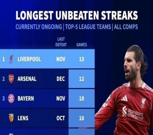 德转丨五大联赛球队目前不败场次榜